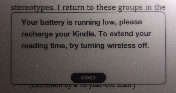There is one thing that I really don't like though, and it's the low battery notification. The battery lasts for weeks, so I rarely think about charging it. I am also rarely on a screen that displays battery life--I'm just reading away and when you're reading, all you see is the book text. So the only time I think to charge it is when I see this note pop up, and every time I see it I groan: